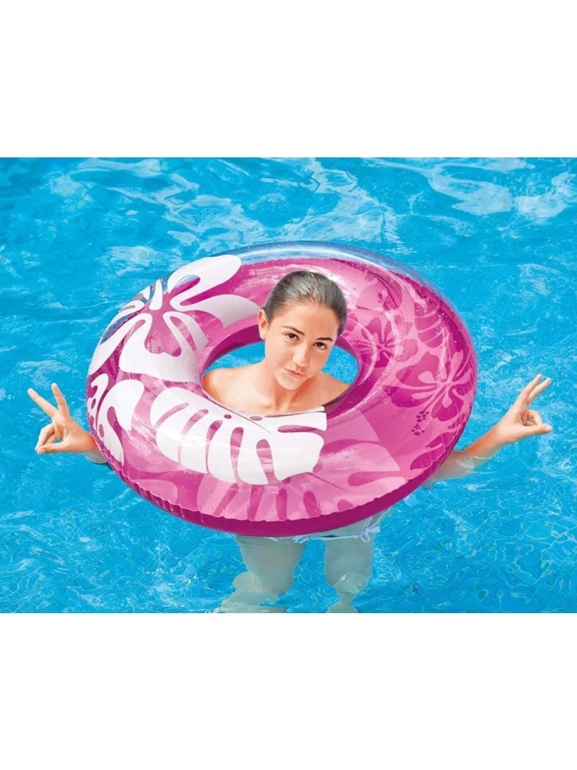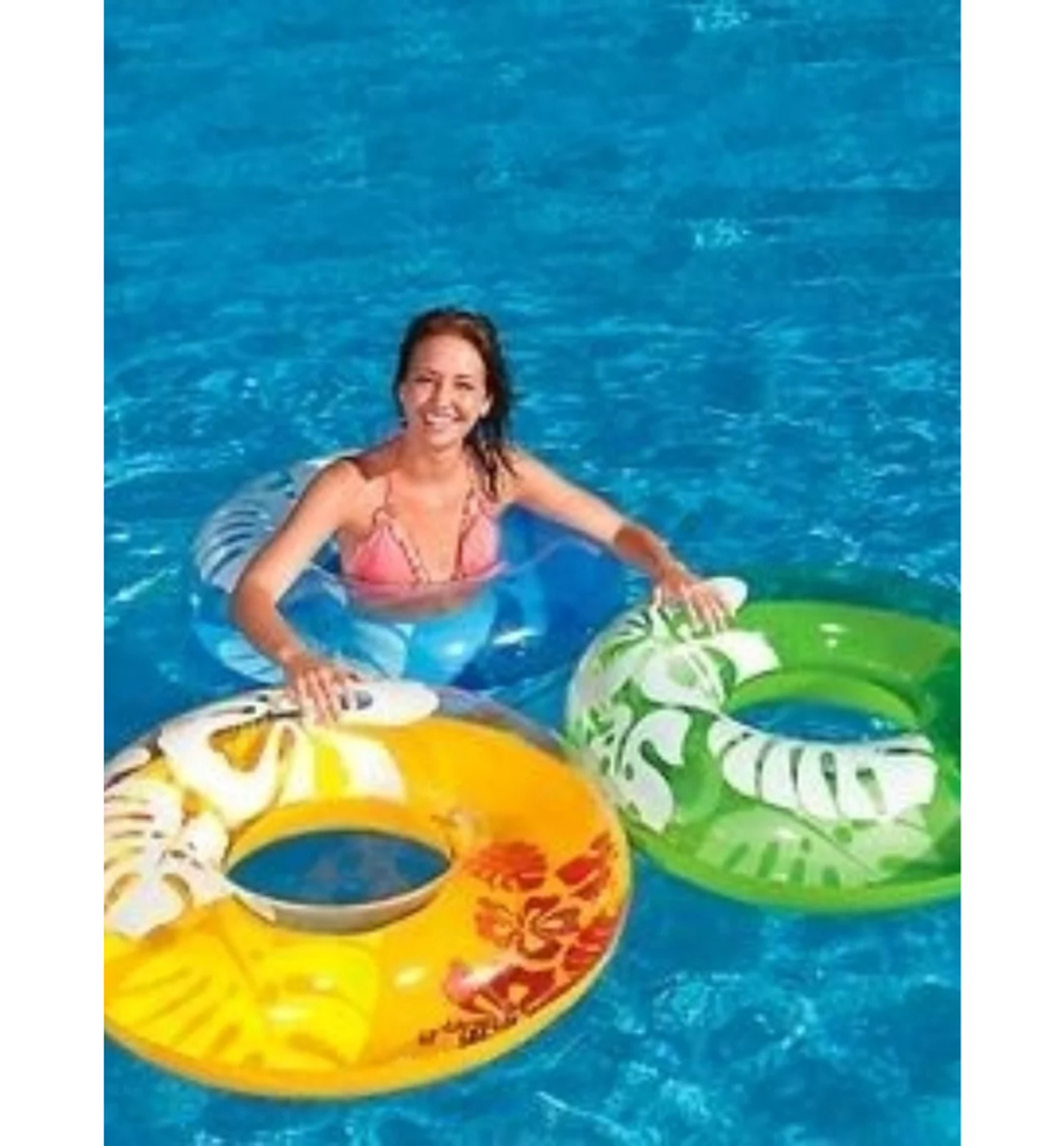The Tropical Print Inflatable Swim Ring Floats are the ultimate accessory for stylish relaxation during your water activities. This eye-catching set includes three large rings, each sporting a distinct, vivid color scheme (purple, blue, and orange) overlaid with a breezy tropical leaf pattern set against a clear background. Made from high-quality, durable vinyl, these floats offer robust support for both adults and older children while ensuring long-lasting fun throughout the summer season. The spacious inner diameter allows for comfortable lounging and floating. Easily inflatable and deflatable for quick setup and compact storage, this trio is essential for bringing a vibrant, island-inspired aesthetic to your swimming pool, lake outing, or vacation resort.