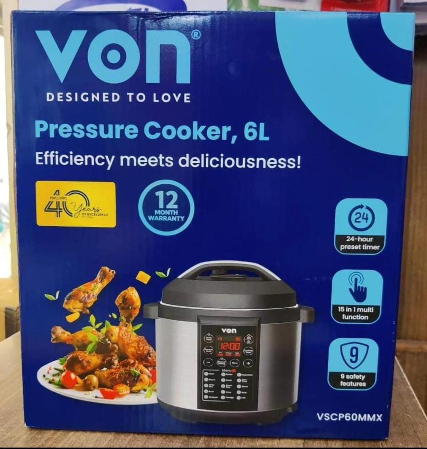 The Von electric pressure cooker is a versatile kitchen essential that revolutionizes the way you prepare meals. With its advanced pressure cooking technology, this appliance significantly reduces cooking times while locking in flavors and nutrients, making it ideal for busy families and meal prep enthusiasts. Featuring multiple cooking functions, including pressure cooking, slow cooking, sautéing, and steaming, it allows you to create a wide variety of dishes with ease. The intuitive digital control panel offers pre-set cooking programs and adjustable settings for precise temperature and timing. Designed with safety in mind, the Von electric pressure cooker includes multiple safety features, such as a secure lid locking mechanism and pressure release valve. Its sleek design and compact size make it a stylish addition to any kitchen countertop. Whether you're preparing a hearty stew, perfectly cooked rice, or tender meats, the Von electric pressure cooker is your go-to tool for quick and delicious meals.