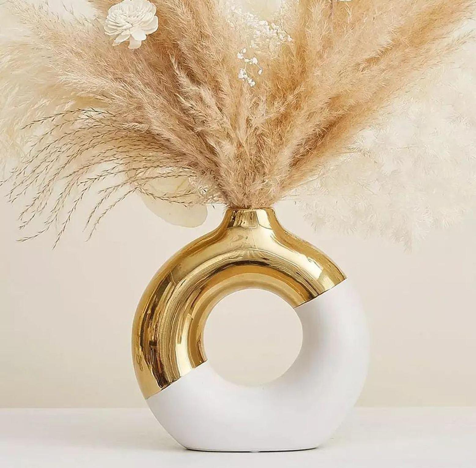 Enhance your interior aesthetic with our white gold ceramic vase, a stunning piece that embodies modern minimalism. Crafted with care, this vase features a sleek white finish accented by subtle gold detailing, creating a harmonious balance that exudes elegance. Its clean lines and simple silhouette make it a versatile addition to any decor style, whether placed on a mantel, coffee table, or shelf. Perfect for showcasing fresh flowers, dried arrangements, or standing alone as a decorative accent, this vase brings a touch of sophistication to your home. The high-quality ceramic construction ensures durability while maintaining an elegant appearance. Add this exquisite white gold ceramic vase to your collection and watch it transform your living space into a serene and stylish retreat.